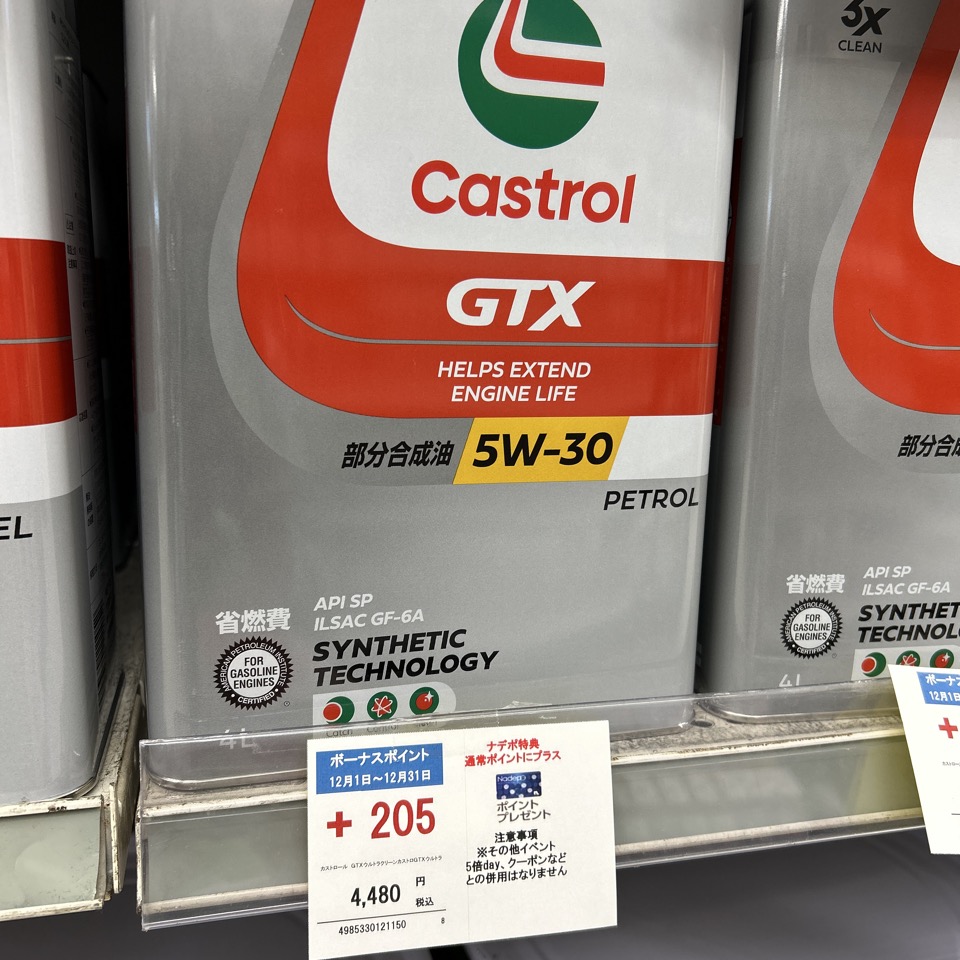 近所のホームセンターにはCastrolの商品が置いてあることが多く、部分合成油でもこのお値段!!んー高くなりましたわ。