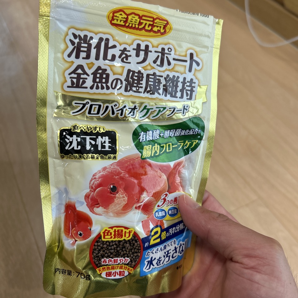 この方法で、現在は出目金ちゃんも底に落ちたエサを食べるまでの時間が確保され、うまくいっていると思います。