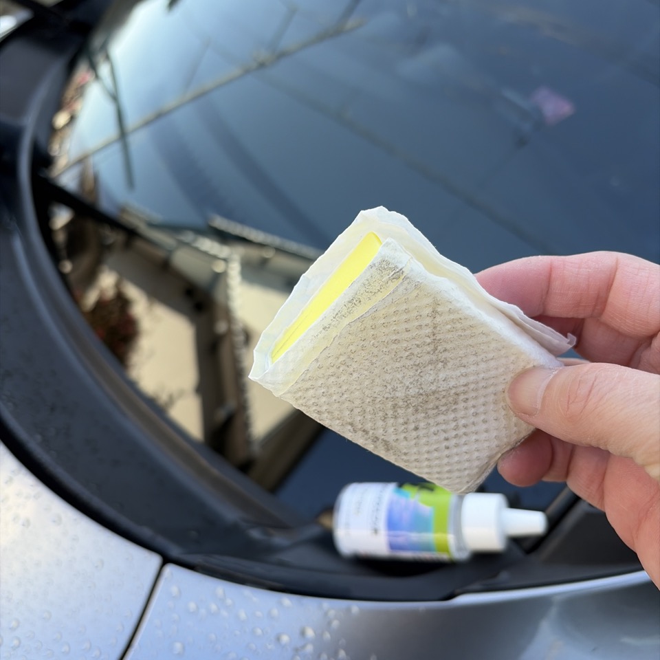 洗車が終わった後の乾いたガラスに、キッチンペーパーをスポンジに巻いてコーティング剤を塗布し、15分後に仕上げ拭きをして終了です。
