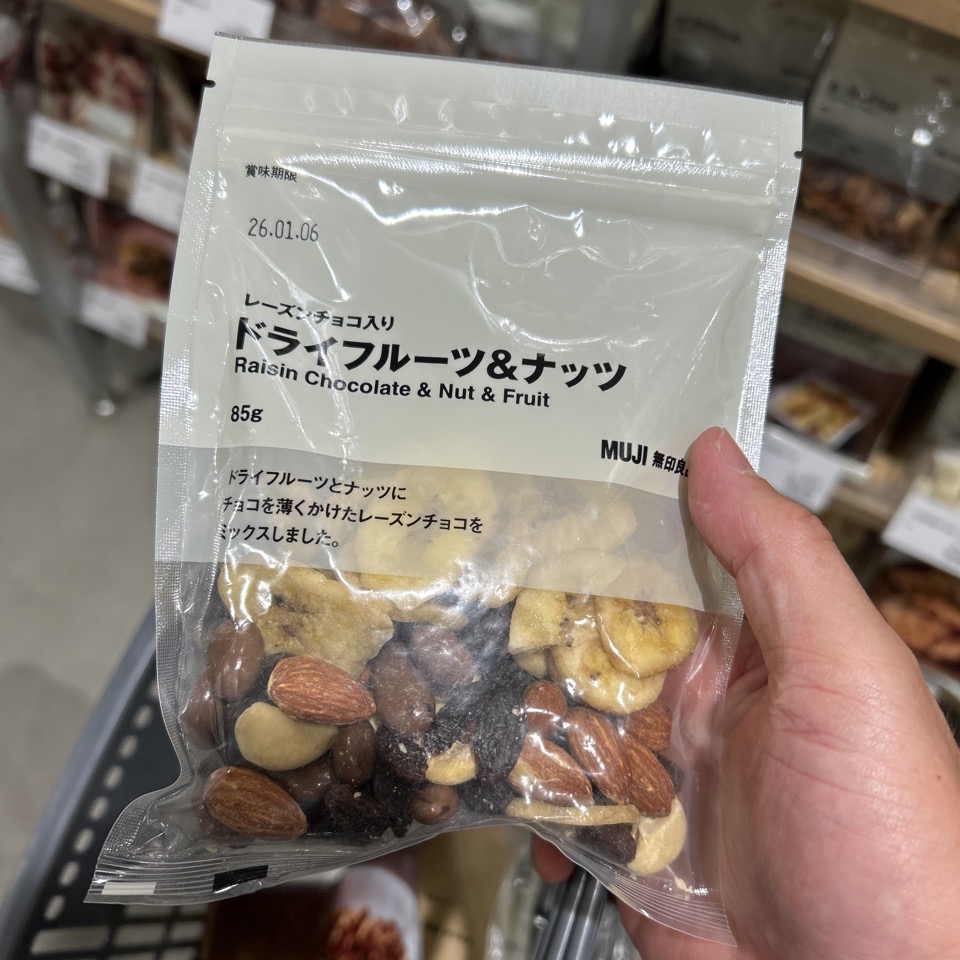 普段、ミックスナッツはよく食べるのですが、それにバナナ等のドライフルーツとチョコレートが入っています。少し甘いものを食べたい時に、小腹も満たせて、甘いもの食べたい欲も満たすことができます。そして見ての通り、あまり大きい袋ではなくそのためお値段も手頃になっています。この辺りが絶妙で、良いところです。