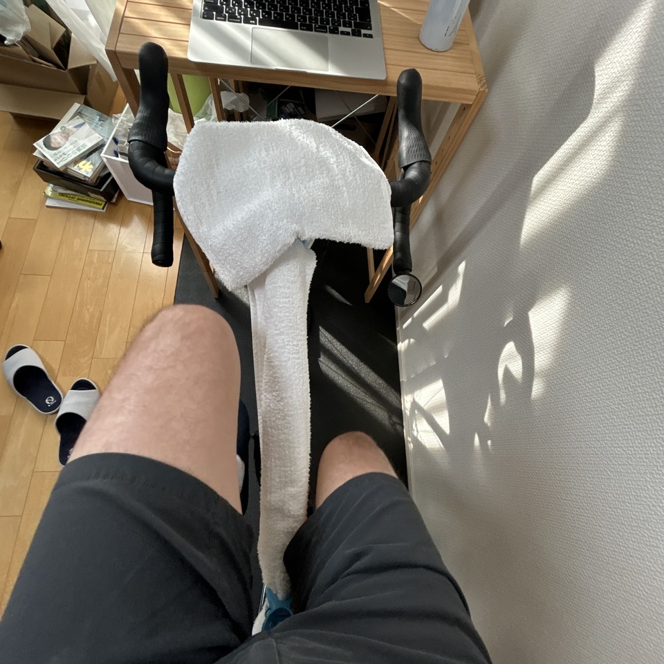 夏の間は、自転車ローラー台をするときはエアコンや扇風機が必須です。普通、ジムとかに行かない方は実感がないとは思いますが、自転車って常に前から風を浴びているのでそんなに「暑い」と感じませんが、室内で自転車を漕いでいるとものすごく暑いです…。汗が全然乾いていかず、体温も下がらないので、さらにどんどん汗をかきます。だからこそ、運動にもなるんですけどね。