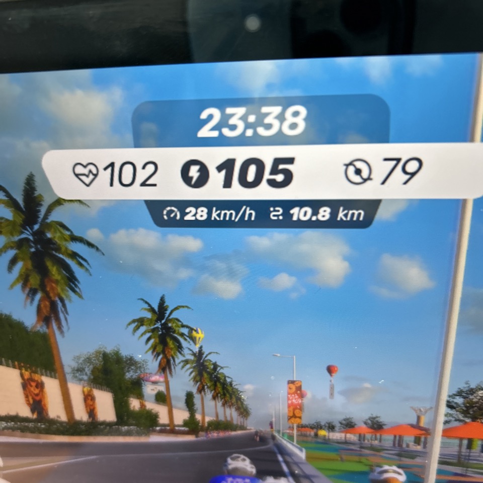 下記写真の真ん中に表示されている「68」というのが、現在ペダルを漕いでいる強さになり、68Wと言います。Branchはみんなで走るペース走のような感じで、いつも利用しているのは1.5w/kgくらいのペースです。これだと私の体重が60kgくらいなので、平均90wくらいで走る集団のペース走ということになります。